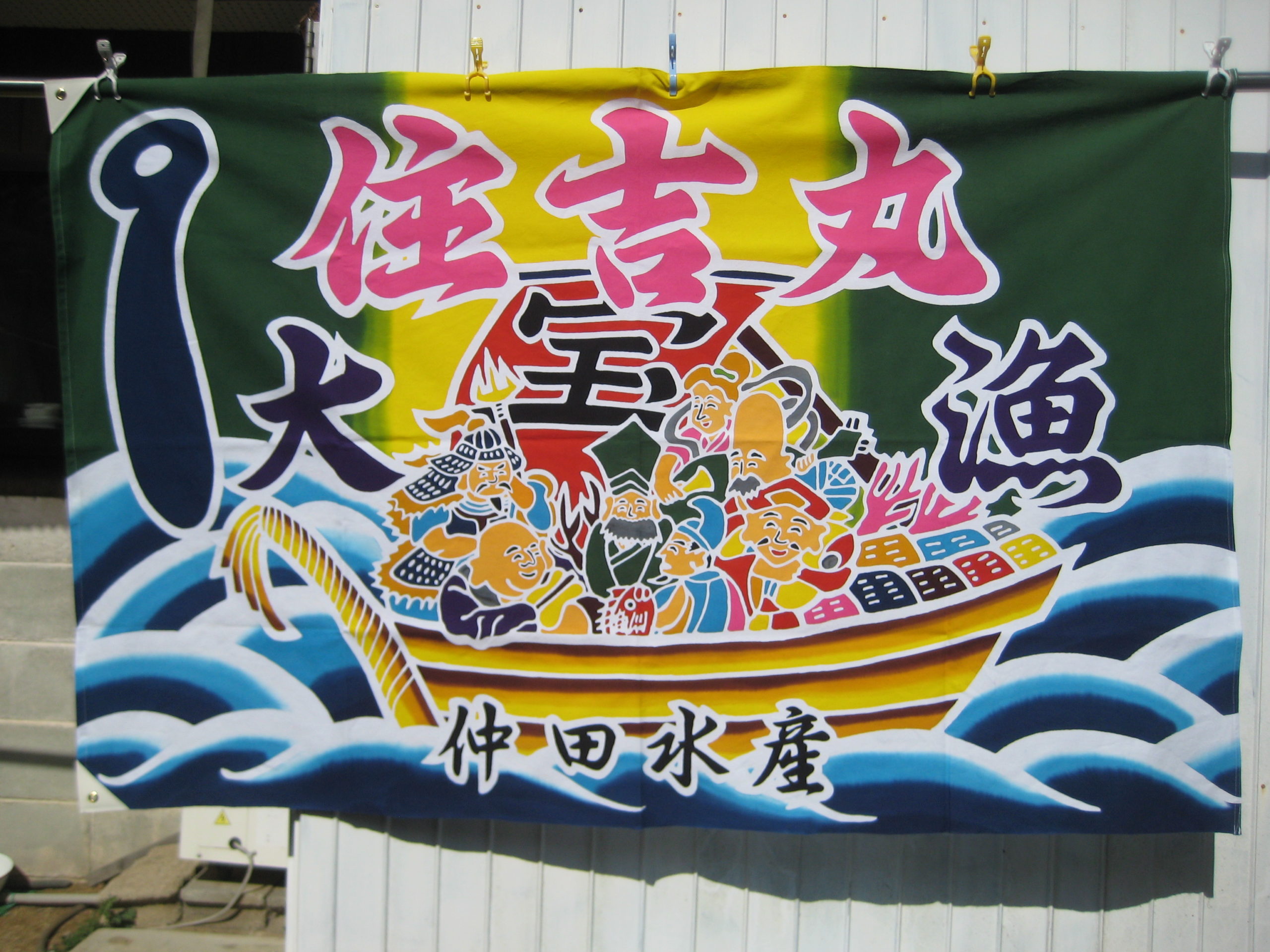 淡路島 淡路市岩屋 大漁旗のご依頼いただきました。 未分類 2021.11.02 岩屋の仲田水産様から大漁旗のご依頼頂き作成しました。七福神が良いとの事でしたので写真のような柄で、後はお任せで、染めました。喜んで頂きました。またお願いねって言われるのが一番嬉しいです。有難うございました。