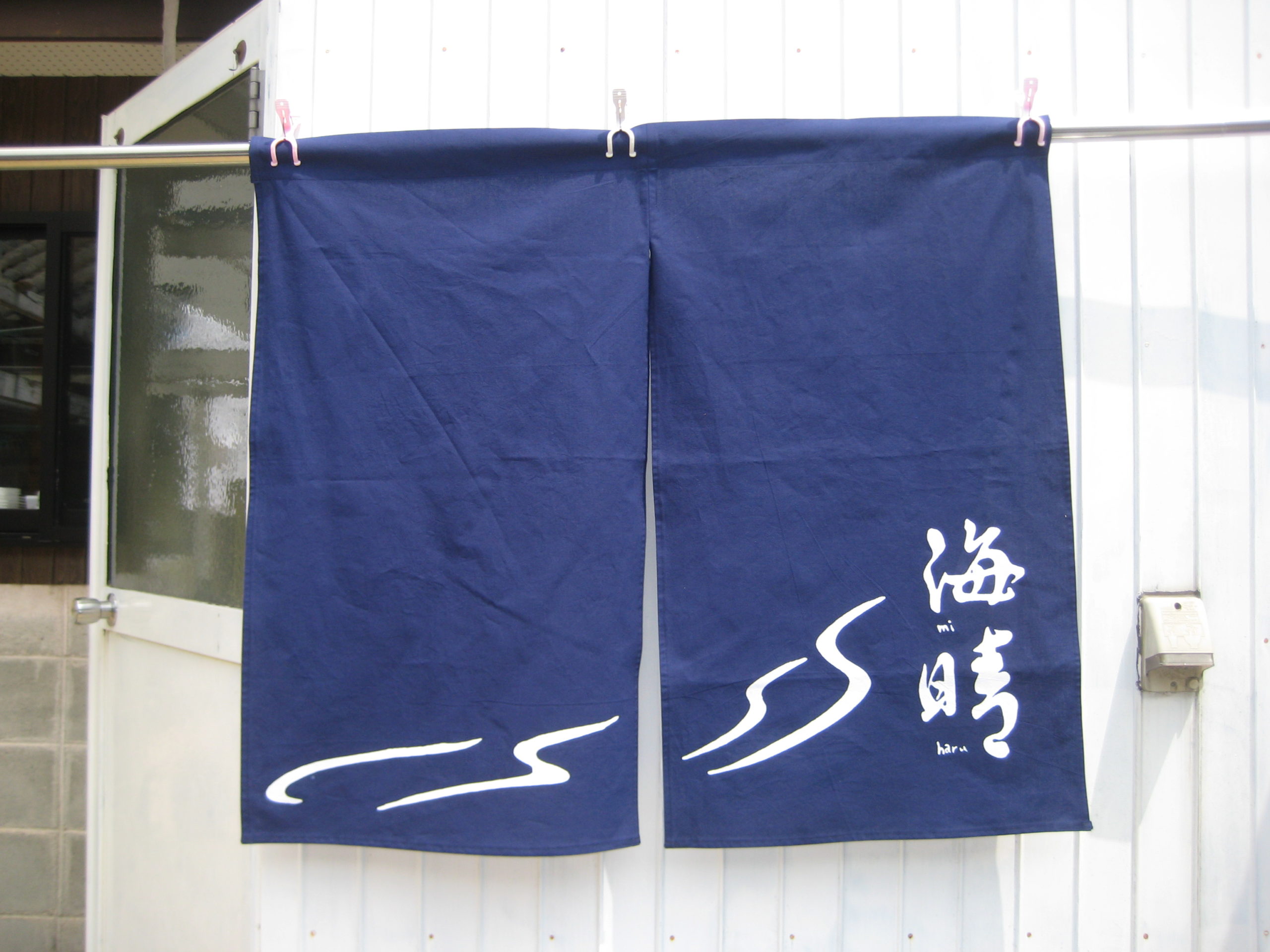 淡路 のれんのご依頼いただきました。 未分類 2022.08.03 洲本市堀端筋の海晴さまの、店内のカウンターや通路ののれん作成しました。 壁紙が朱色なので 紺地白抜です。 掛ける竹と金具も設置しました。事前に現場に行き採寸の上で、ですので寸法ぴったりです。 随分喜んでいただきました。