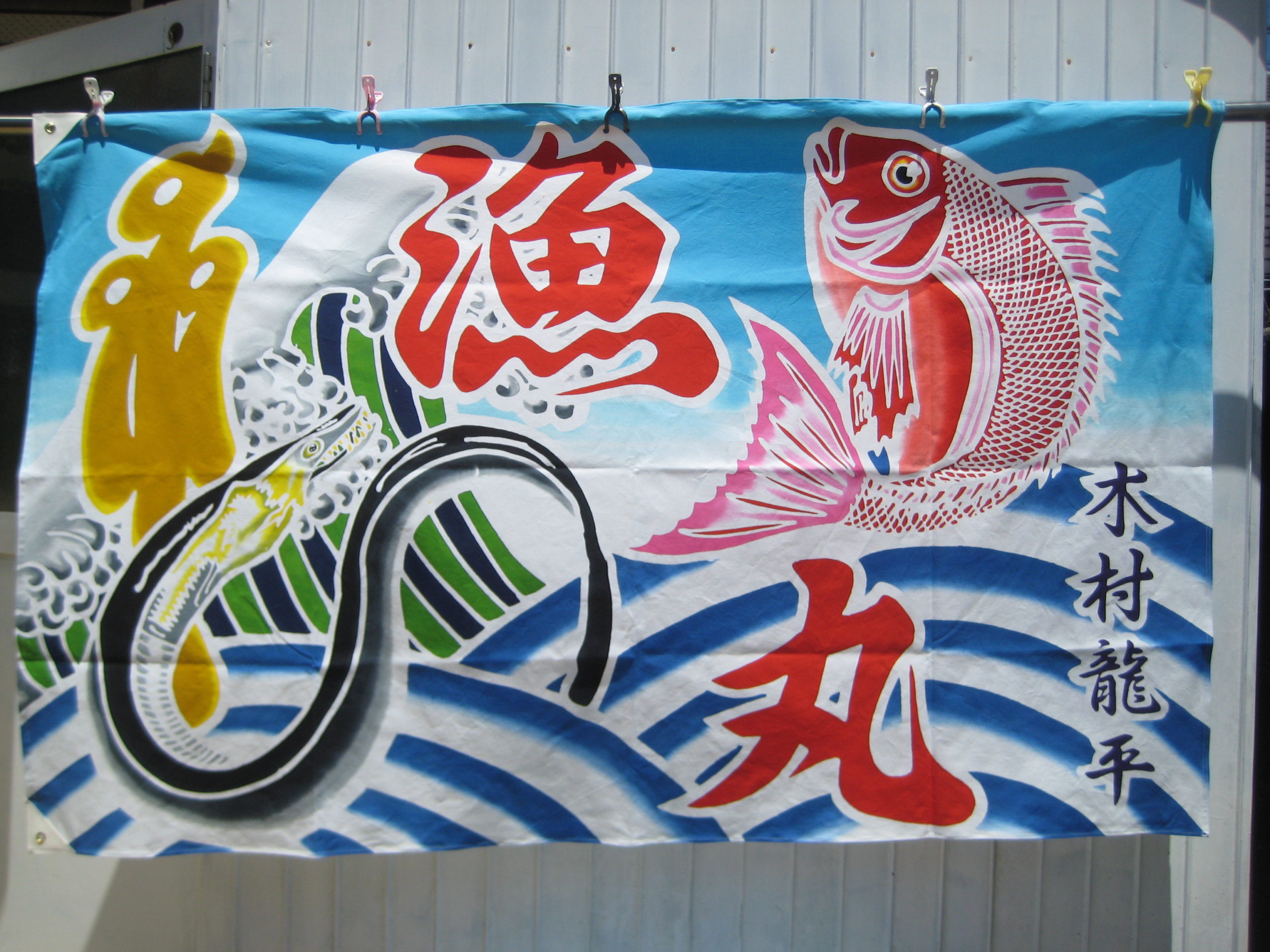 淡路 大漁旗のご依頼いただきました。 未分類 2022.08.16 南あわじ市沼島の漁丸様の大漁旗作成しました。 大きい鯛と、鱧の対に波に丸熨斗にです。 木村屋旅館様の木村さんの希望は活きの良い鯛と鱧でそれ以外はお任せ。 弊店のオリジナルのデザインです。同業他社様はくれぐれもパクらないように宜しくお願い致します。 木村さん毎度、有難うございます。