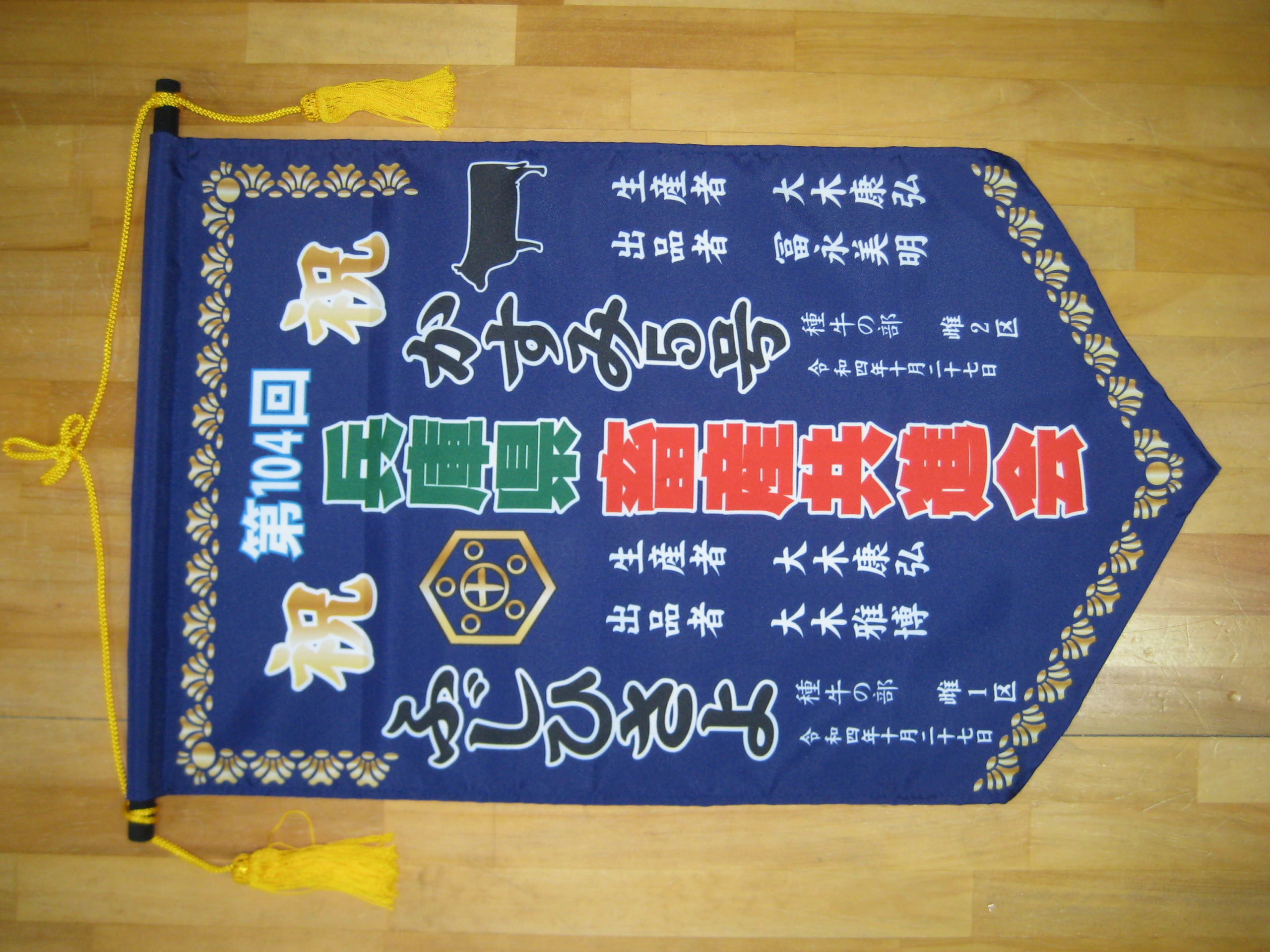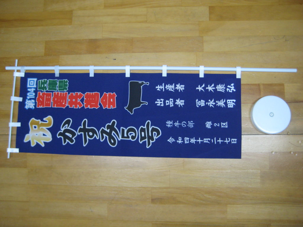 淡路 旗のご依頼いただきました。 未分類 2022.12.05 淡路市の常連様から垂旗と小のぼりを作成しました。 大会名と紋、年月日、生産者、出品者など入れました。 垂旗もなるべく豪華に見えるように。毎度有難うございます。