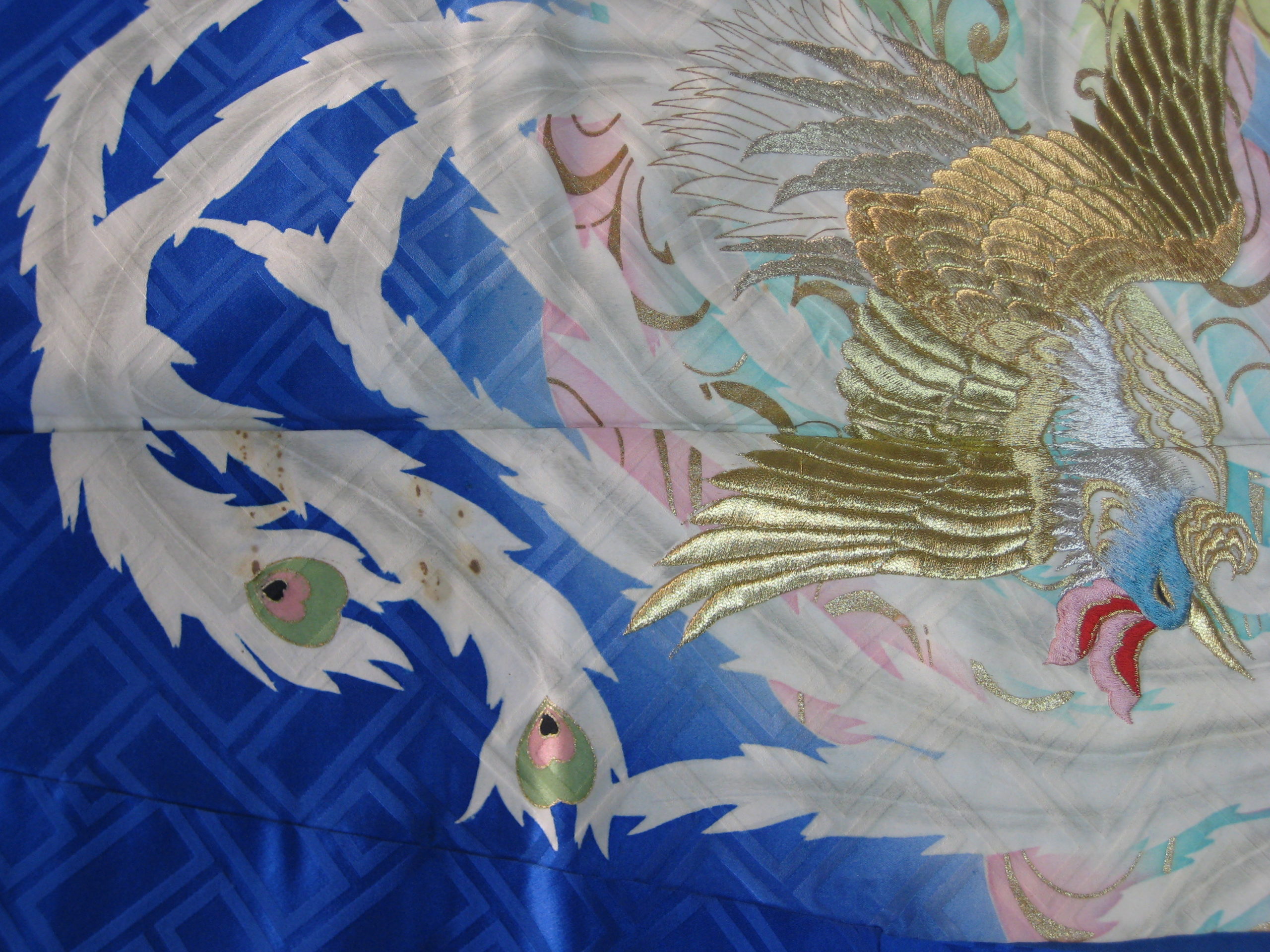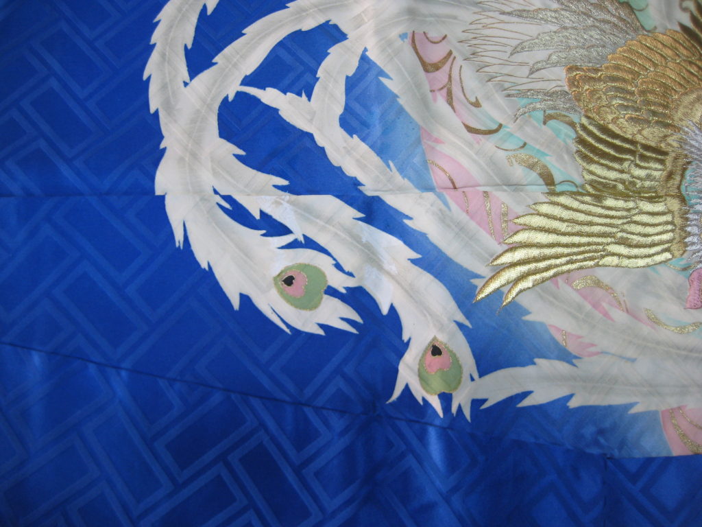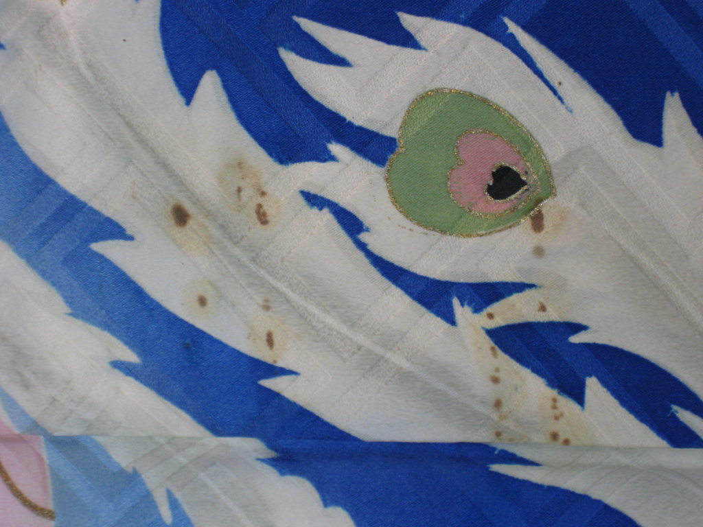 淡路 着物のクリーニングのご依頼いただきました。 未分類 2023.01.09 洲本市の貸衣装のフタツキ様の振袖のクリーニングしました。 かなり古そうな黒いシミなのです。 上前で目立つのでいつも通り何とかと。 「しみ隠し」で鳳凰の白い羽の柄を直すようにしました。 年末に預かり、成人式までの納期も何とか間に合いました。 毎度有難うございます。