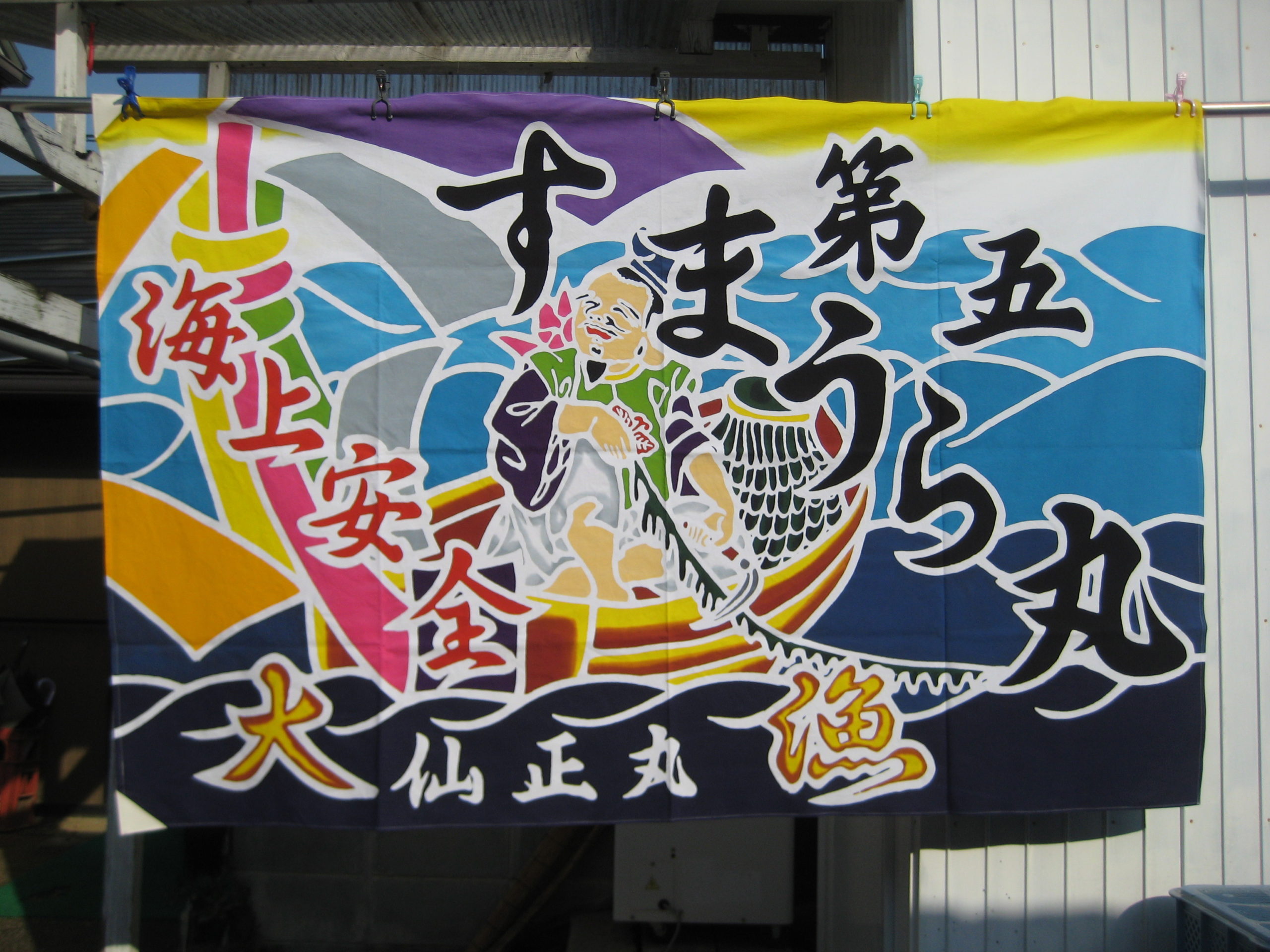 大漁旗のご依頼いただきました。 未分類 2023.02.10 2023.02.09 第五すまうら丸様の大漁旗作成しました。 海苔の船なので、えびす様が「藻を刈る」→「儲かる」、海苔を刈っているようにも見えます。 さのや染物店オリジナルの大漁旗のデザインです。 くれぐれも同業者様はデザインをパクらないように宜しくお願い致します。