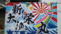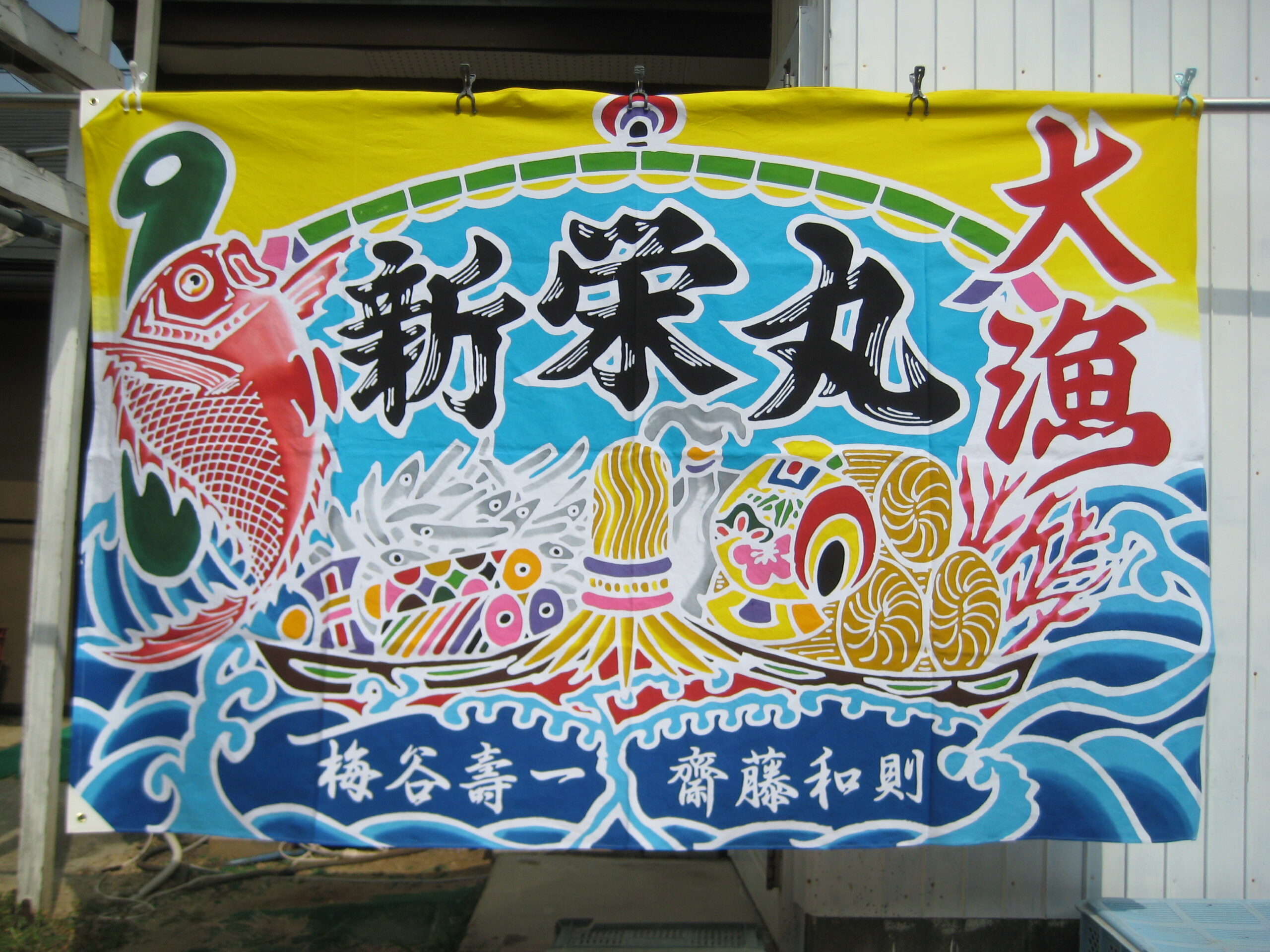 あわじ 大漁旗のご依頼いただきました。 未分類 2023.10.04 淡路市育波の新栄丸様の大漁旗作成しました。 船主様から、直接のご注文です。 弊店の柄の丸熨斗に大宝船しらすイカナゴに鯛の大漁、波です。 色使いも気に入って頂き、大変喜んで頂きました。 毎度有難うございます。