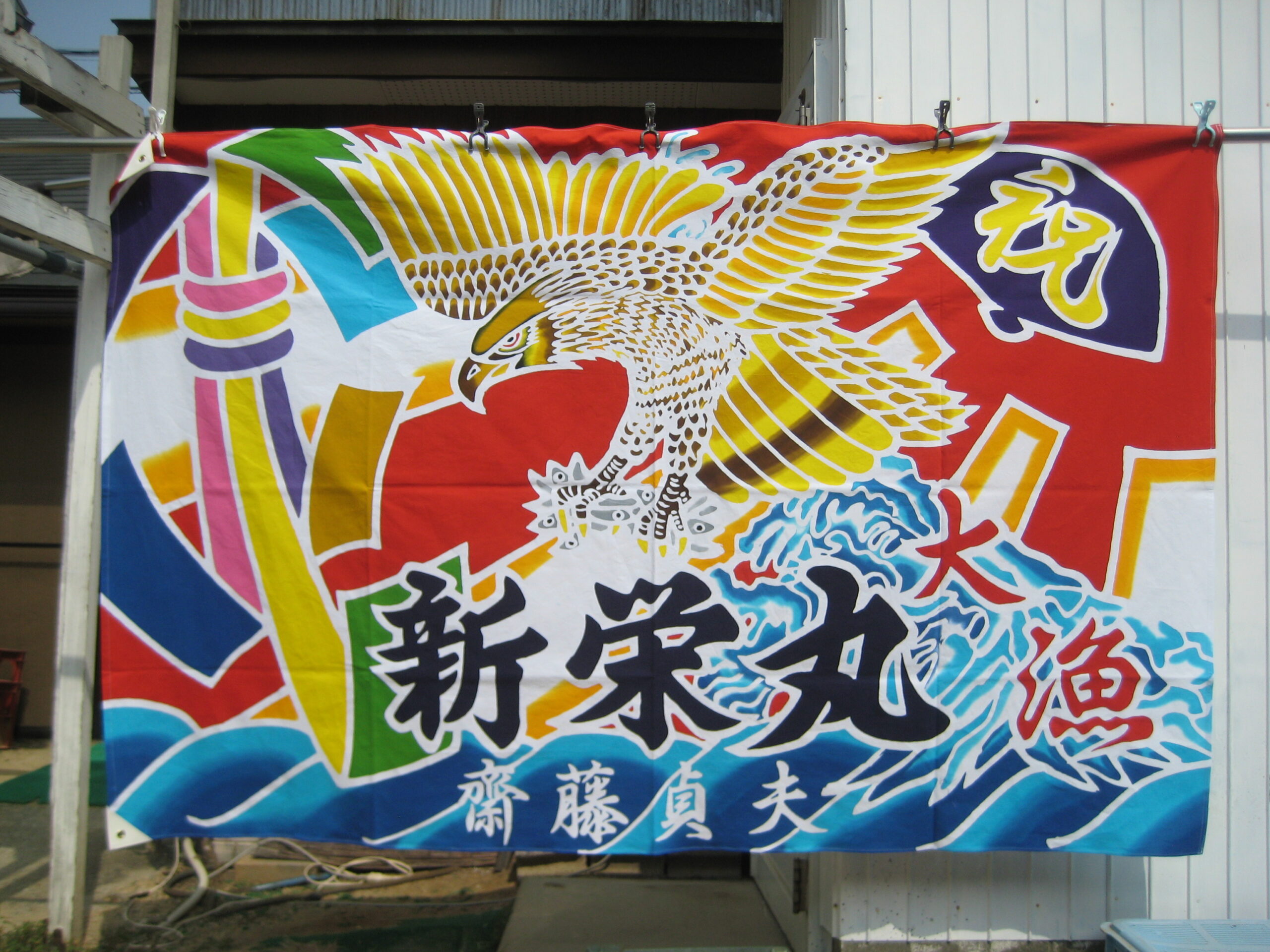 淡路島 大漁旗のご依頼いただきました。 未分類 2023.10.05 淡路市育波の新栄丸様の大漁旗作成しました。 船主様から、直接のご注文です。 弊店の柄の束ね熨斗の旭に大鷲のしらすイカナゴの鷲掴みの大波です。 色使いも気に入って頂き、大変喜んで頂きました。 毎度有難うございます。 未分類