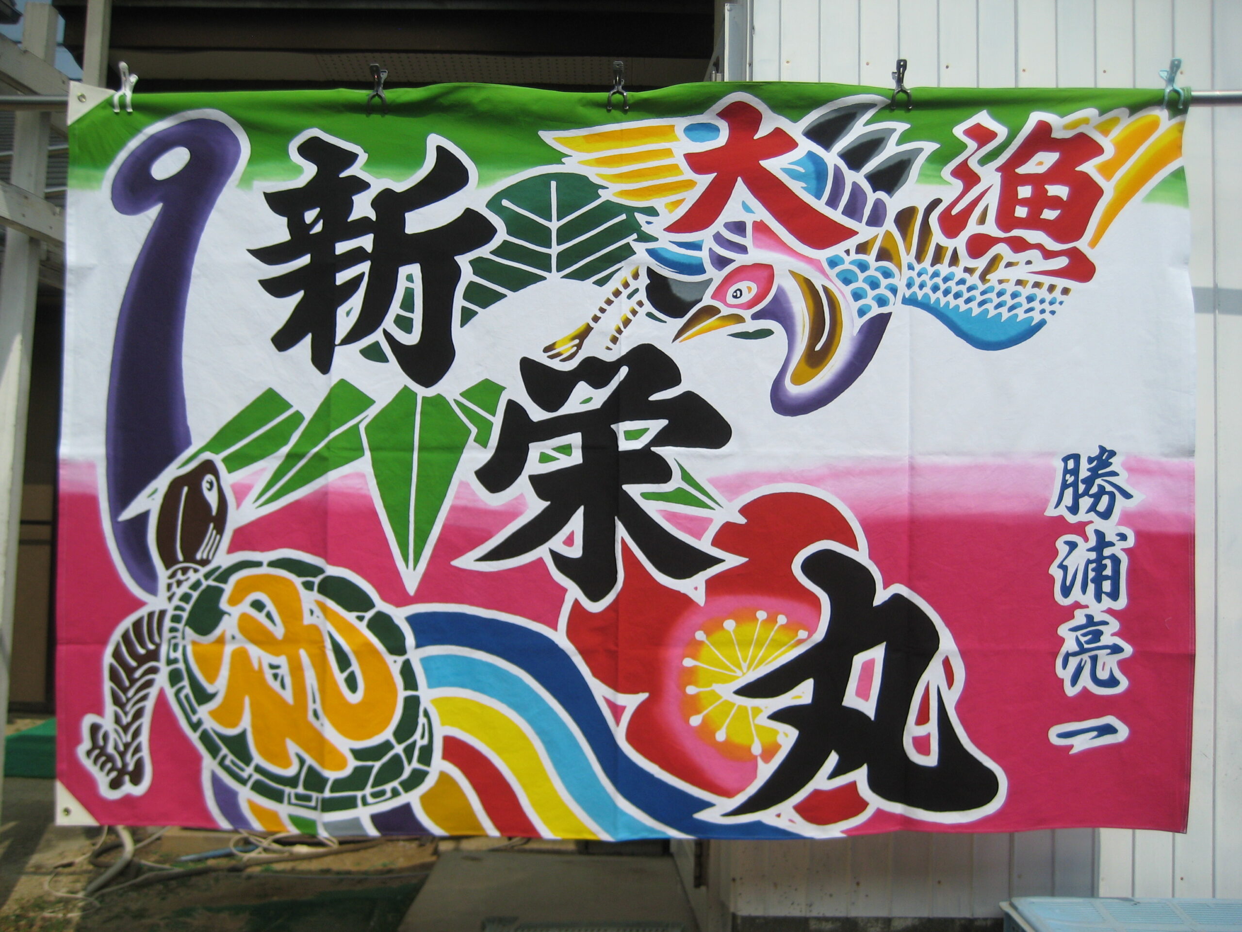 淡路 大漁旗のご依頼いただきました。 未分類 2023.10.12 淡路市育波の新栄丸様の大漁旗作成しました。 弊店の柄の丸熨斗に大漁鶴に祝い亀の松竹梅です。 大変喜んで頂きました。 毎度有難うございます。 未分類