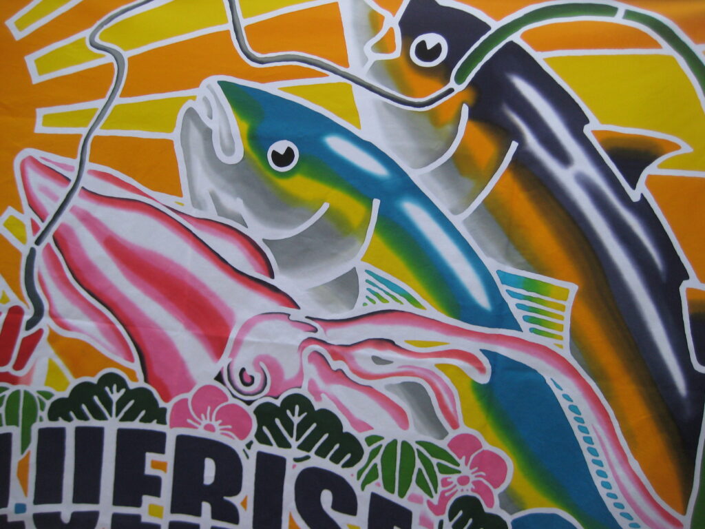 大漁旗のご依頼いただきました。 未分類 2023.12.16 三重県の釣具店のパーフェクション様からのご注文で大漁旗作成しました。 BLUE RISE 綾心丸様への大漁旗です。 大体のイメージを頂き、鯛、カツオ、ハマチ、イカなどのボカシ染は適当に弊店でさせて頂きました。 大変、喜んで頂きました。 毎度有難うございます。