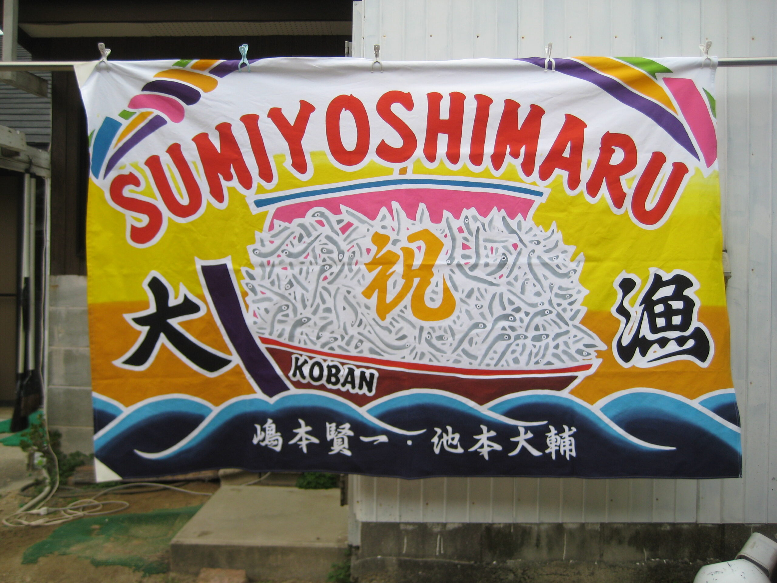 淡路島 大漁旗のご依頼いただきました。 未分類 2024.04.04 淡路市岩屋の小判水産様の旗、大漁旗を作成しました。 お客様の希望で、「住吉丸をローマ字で宝船に大漁のしらすに船はKOBAN」のデザインです。 大変、喜んで頂きました。 毎度有難うございます。