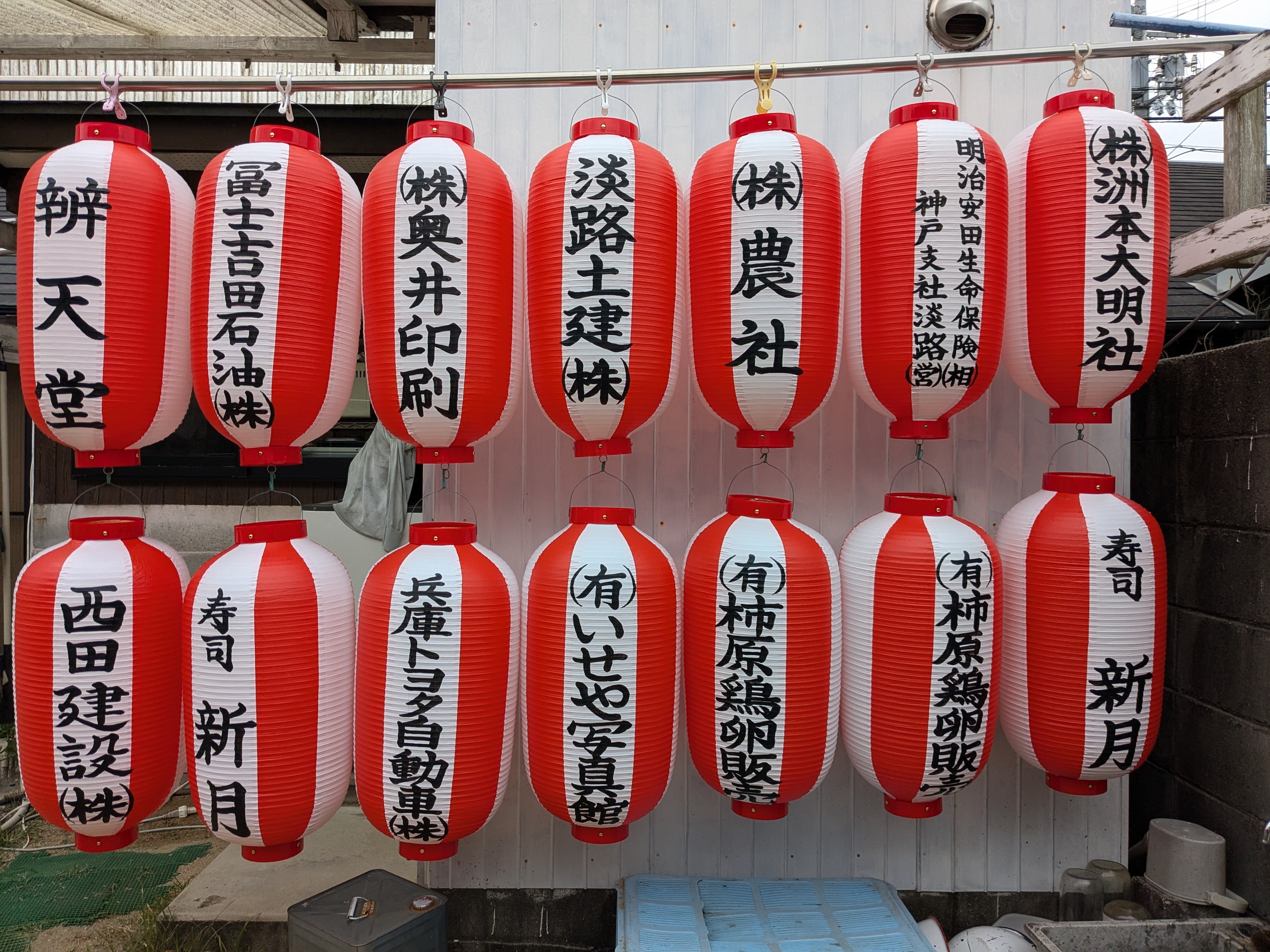 淡路島 提灯のご依頼いただきました。 未分類 2024.07.24 淡路島まつりの協賛名入れちょうちん作成しました。 二長の大きめのビニールちょうちんに両面名入れ手書きしました。 毎度有難うございます。