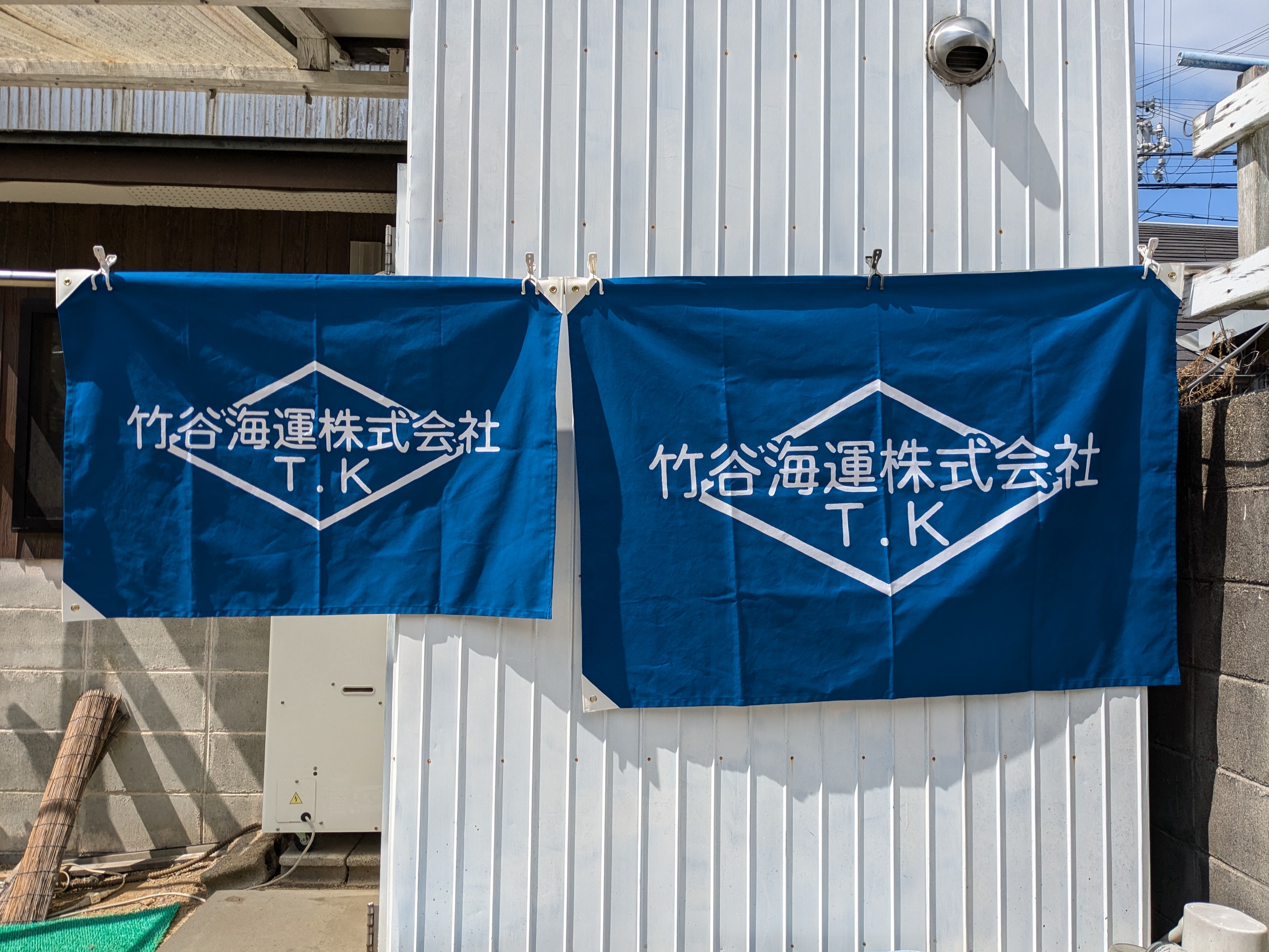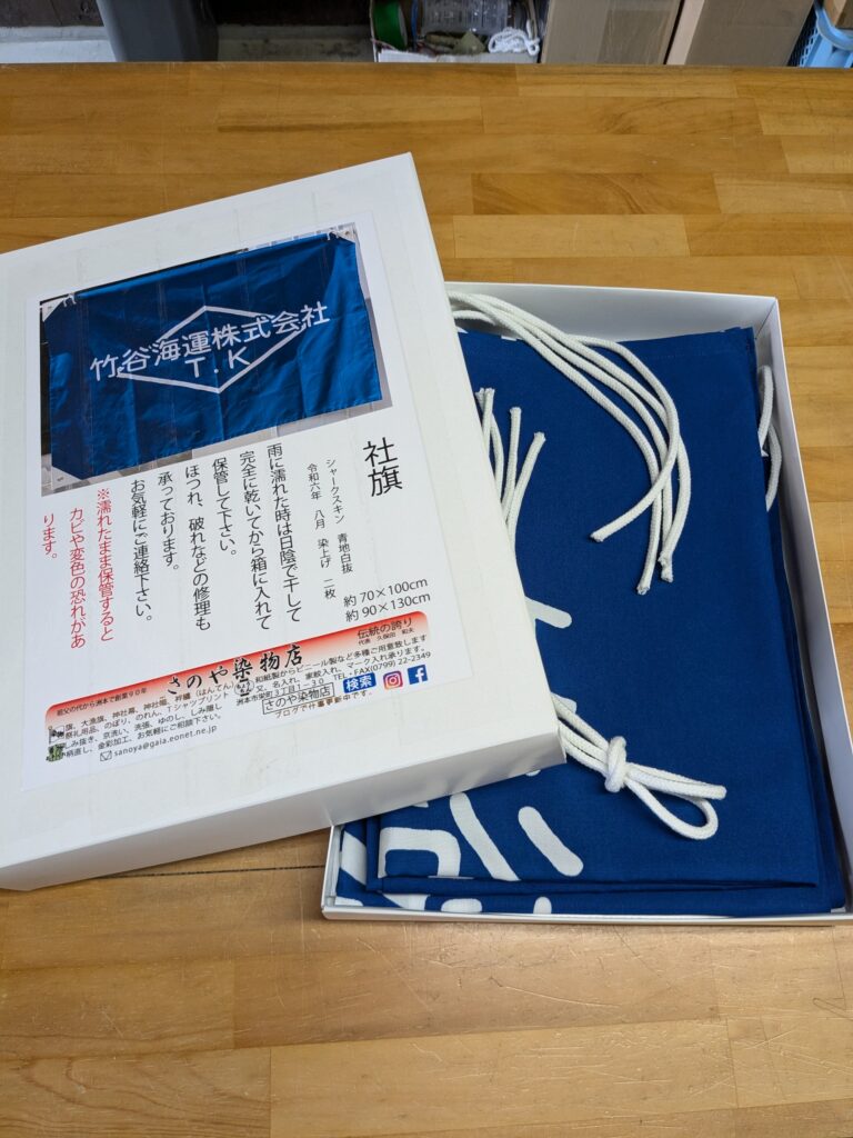 淡路島 旗のご依頼いただきました。 未分類 2024.08.24 南あわじ市福良の竹谷海運株式会社様の社旗を作成しました。 厚手のシャークスキンで、ロイヤルブルー地白抜きです。 風に強い四方三巻補強仕立てです。 壁にも飾れるように三方ハトメ仕立てです。 短い納期でしたが間に合いました。 保管用化粧箱です。 こちらが竹谷海運株式会社様のホームページです。 大変、喜んで頂きました。 毎度、有難うございます。