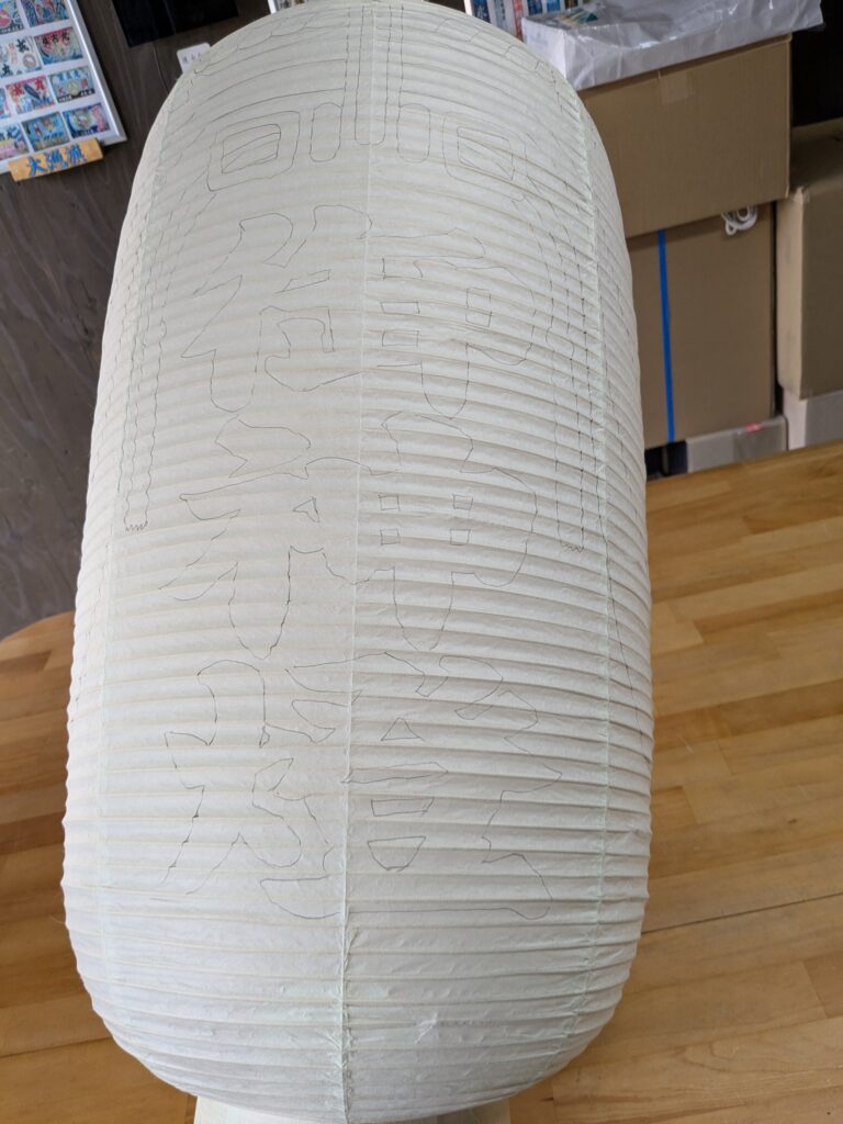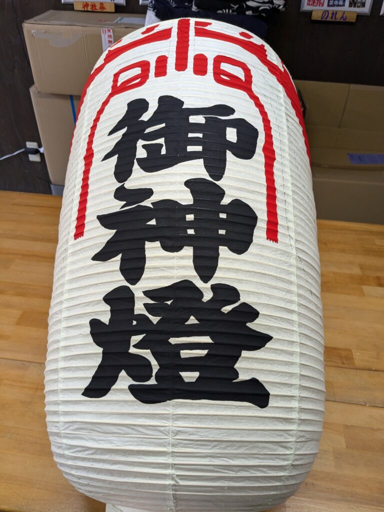 あわじしま ちょうちんのご依頼いただきました。 未分類 2024.08.27 淡路市山田八幡神社様の拝殿用幕入り提灯を作成しました。 和紙の本格的な提燈になります。 火袋に下書きしていきます。 黒で御神燈 三色幕塗りの赤 黄 新橋 黒フチ仕上がりです。 全て手書きです。 最後に上下に皮と、菊チラシ、つるとカンを付けたら終わりです。 大変、喜んで頂きました。