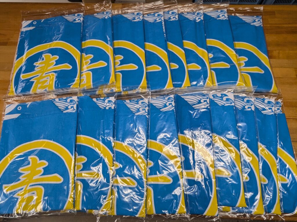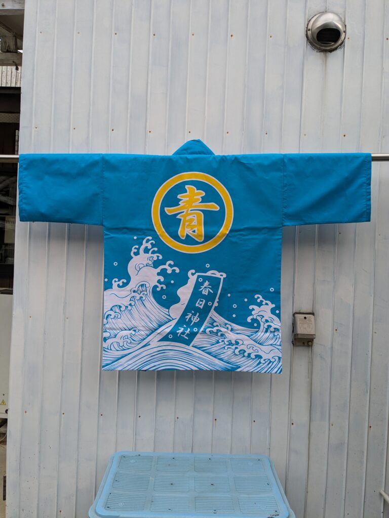 あわじ はんてんのご依頼いただきました。 未分類 2024.10.18 南あわじ市阿那賀の春日神社様の丸山、阿那賀青年団様のハッピを作成しました。 衿は黄色袢纏、衿が綺麗に見えるように仕上げました。 波のデザインの半纏。 地色は水色袢天。 袖は無地伴天。 背中に大きく「丸に青」のはっぴ。 衿裏に小判抜き半被。 波の上には短冊で「春日神社」の法被。 かなりギリギリの納期でしたが間に合いました。 一枚ずつ個別ポリ袋に梱包してお渡ししました。 毎度有難うございます。