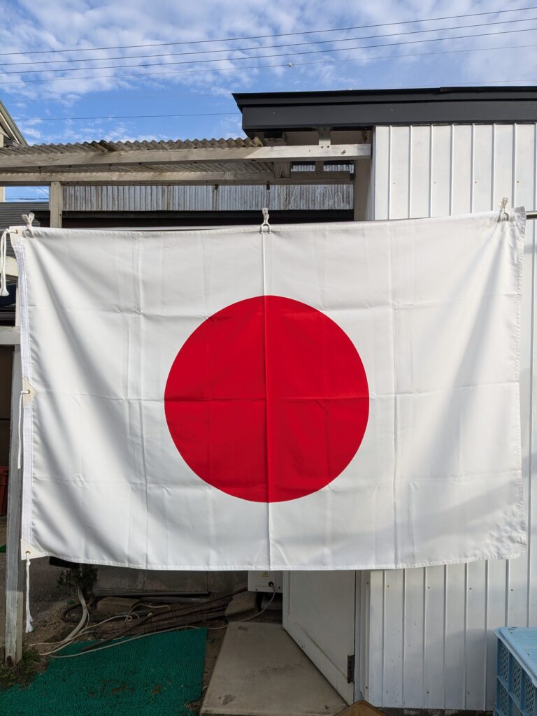 淡路 日ノ丸のご依頼いただきました。 未分類 2024.10.29 南あわじ市国立淡路青少年の家様の屋外用の日の丸国旗作成させて頂きました。 前も写真の紫の章旗も作成させて頂きました。 かなり風の強い所なので白生地挟み込みハトメ三か所に四方三巻補強+サシコ縫い仕立てです。 こちら普通の四方三巻補強仕立てです。 毎度有難うございます。