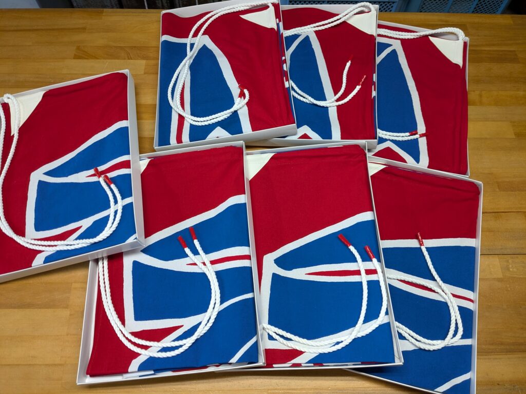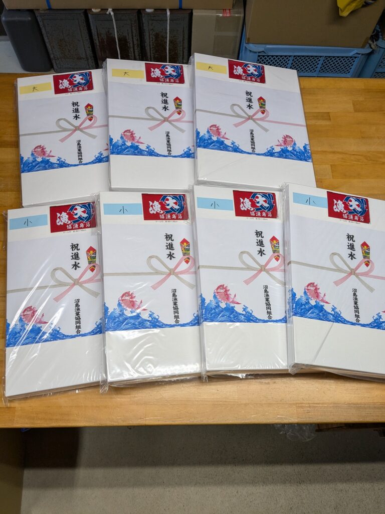 あわじしま 大漁旗のご依頼いただきました。 未分類 2024.12.02 南あわじ市の沼島漁業協同組合様の旗、大漁旗、作成しました。 大小、2種のサイズでロープ仕立てです。 白化粧箱に熨斗紙付です。 毎度有難うございます。