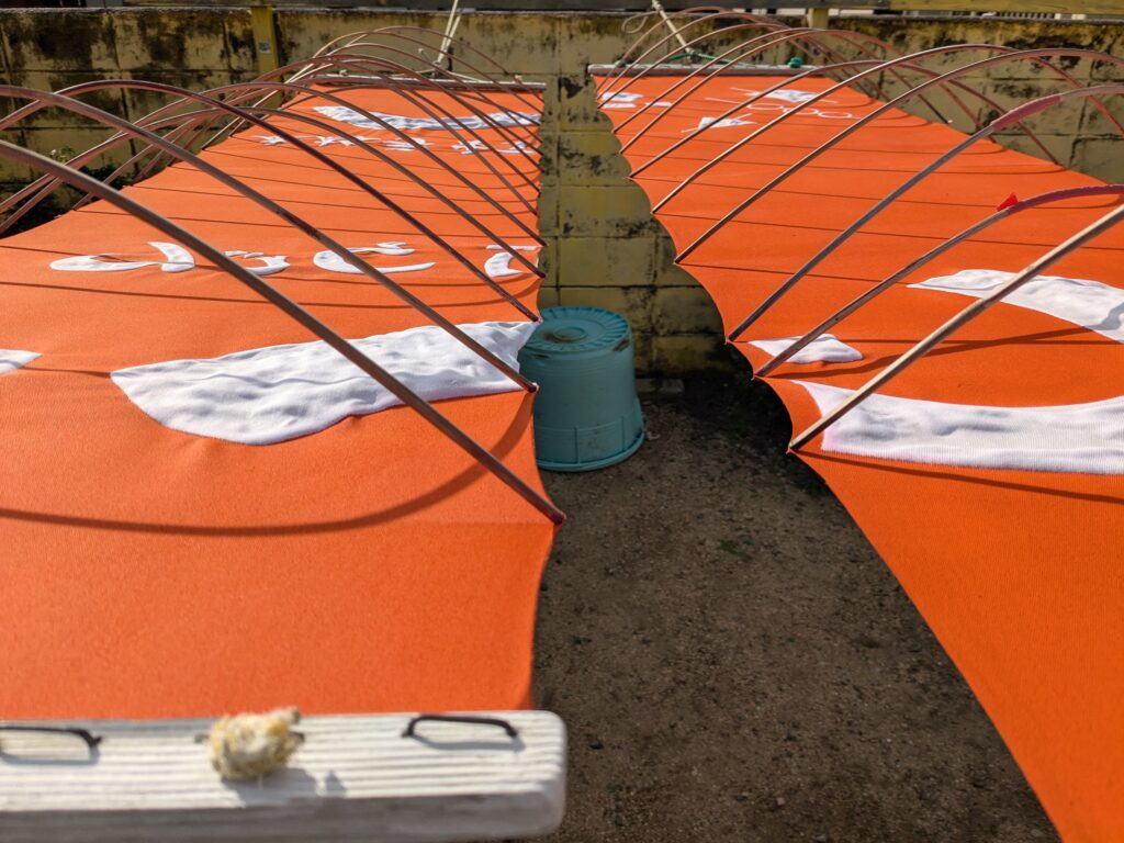 淡路島 のれんの、ご依頼いただきました。 未分類 2024.12.17 洲本市の、もへいじ様の、暖簾を作成させて頂きました。 サイズは前回と同じで、今回は深い山吹地に白抜きです。 焼けにくい顔料染料の引染です。 四方三巻補強仕立てです。 毎度有難うございます。