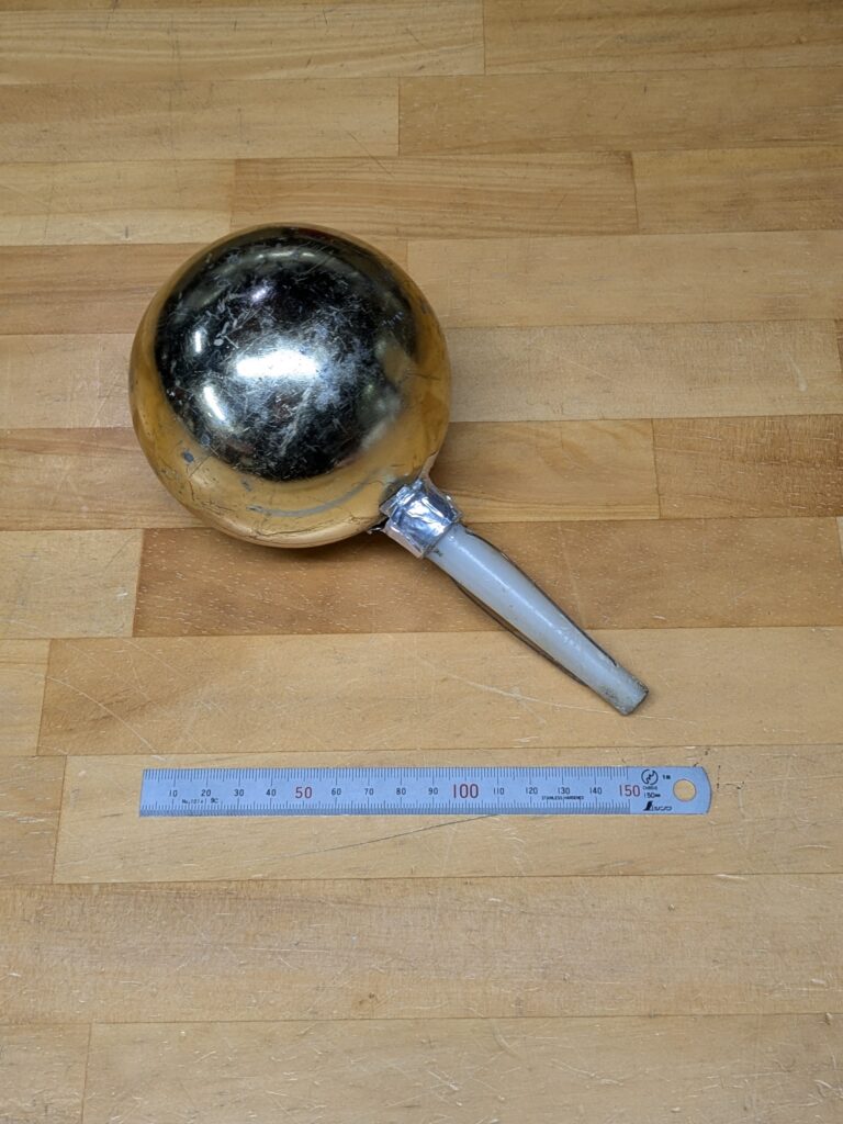 淡路 旗の部品のご依頼いただきました。 未分類 2024.12.21 洲本市の伊勢の森神社様の日の丸のはた、に飾る金球を新調しました。 こちらが古い金球です。 古い金球の寸法をそのまま、ご用意させて頂きました。 家庭で揚げる国旗のと違い大きい金球です。 毎度有難うございます。