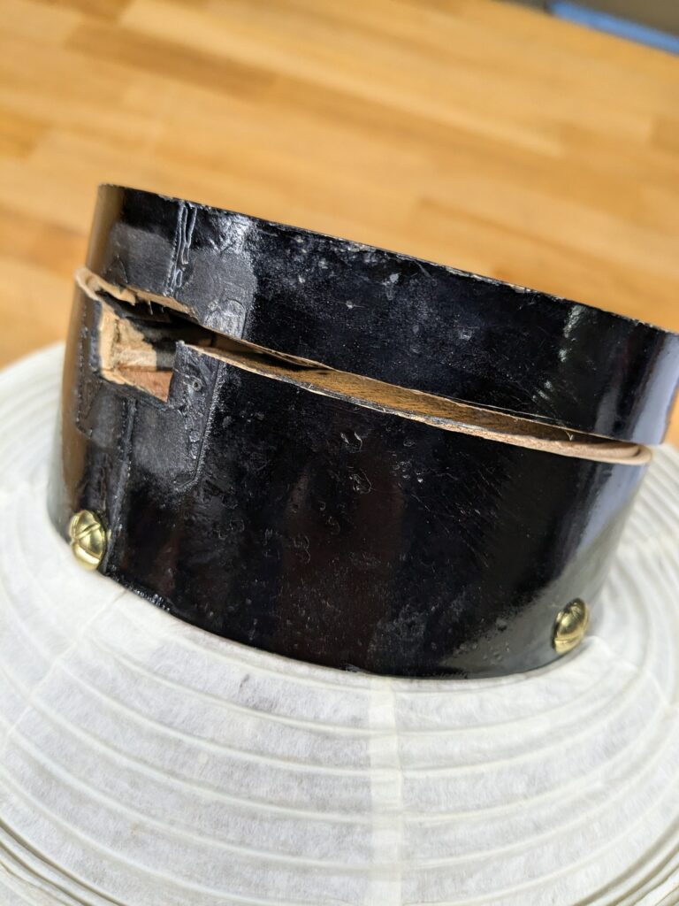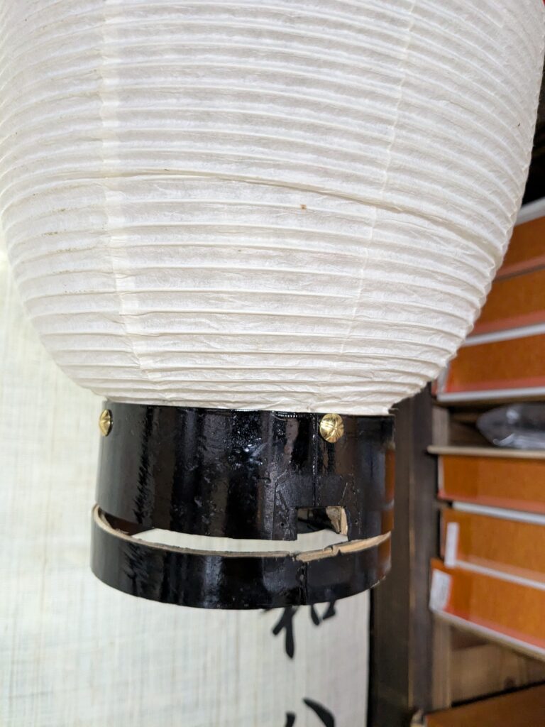 淡路島 ちょうちんの修理のご依頼いただきました。 未分類 2025.02.01 洲本市五色町のお客様から弓張り提灯の修理しました。 完全に下の木の皮が割れてしまってました。 皮だけ取り外して新調も出来るのですが。 今回はお客様のご予算に合わせて、修理しました。 割れている所を、慎重に合わせて、接着。 余分な接着剤を取り、黒に塗直し。 新調するよりもかなりの低予算でここまで修理出来ました。 大変、喜んで頂きました。 毎度有難うございます。