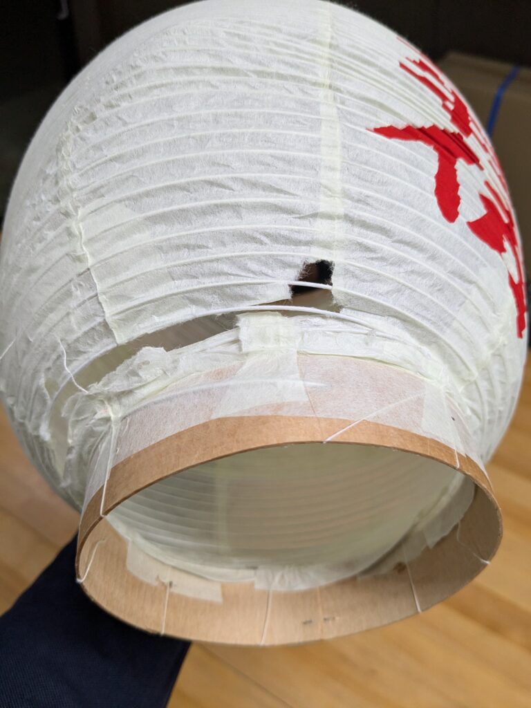 あわじしま ちょうちんの修理のご依頼いただきました。 未分類 2025.02.05 洲本市五色町のお客様から弓張り提灯の修理しました。 提灯の火袋が破れてしまってました。 中から同じ和紙を当てて修理しました。 こちらも同じように破れていました。 ここまで直せます。 低予算で修理しました。 大変、喜んで頂きました。 このように修理も出来ますので、お気軽にお問い合わせください。 毎度有難うございます。