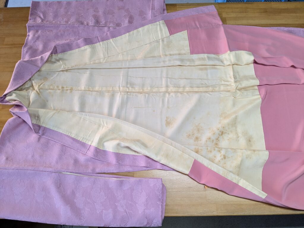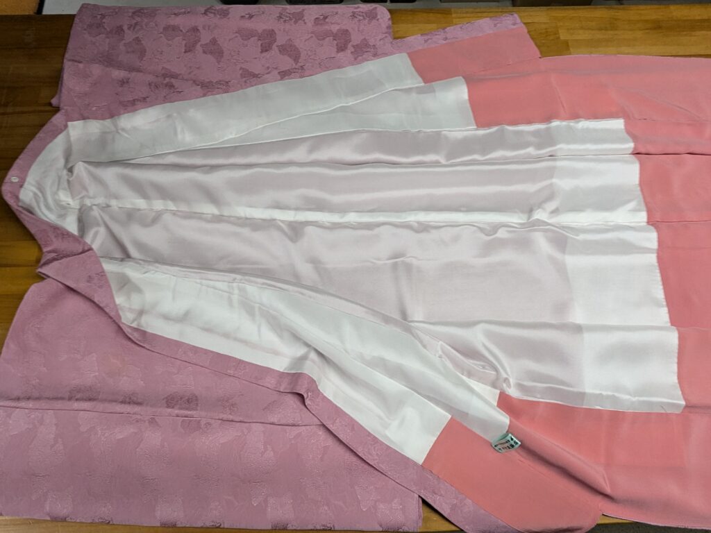 あわじ島 キモノcleaningのご依頼いただきました。 未分類 2025.02.10 洲本市の常連様の着物、袷色無地の仕立て直しをしました。 年数が経ち胴裏が黄変して表に移りそうになってきていました。 胴裏はお客様のお持ちした胴裏を使いました。 表と八掛を生かしました。 「着物が生き返った!」と、大変、喜んで頂きました。 毎度有難うございます。