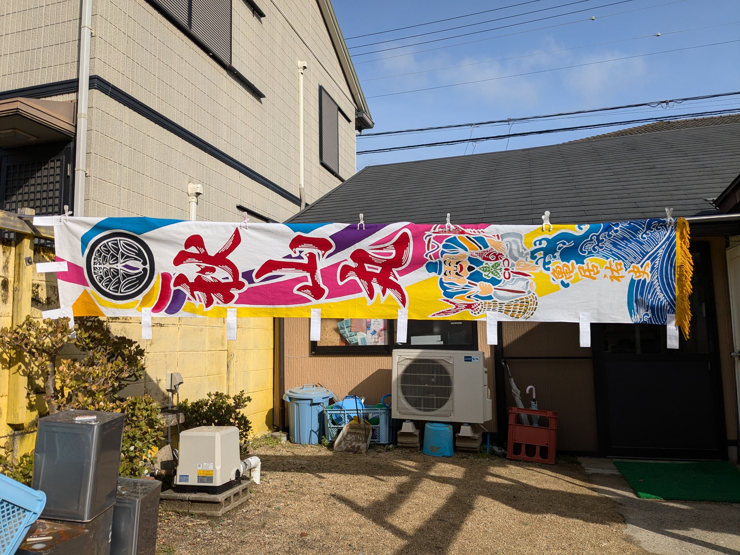あわじ 大漁旗のご依頼いただきました。 未分類 2025.04.02 洲本市由良の秋山丸様の幟を作成しました。 大漁旗のぼりです。船の船尾に面舵、取舵に対で立てます。 今回の大漁幟は取舵側です。 束ね熨斗に秋山さんの紋「丸に抱き茗荷」にえびす様の二枚鯛です。 色合い先日投稿しました面舵側と色は揃えて染めました。 明るい感じですが、力強く。 大変、喜んで頂きました。 毎度有難うございます。