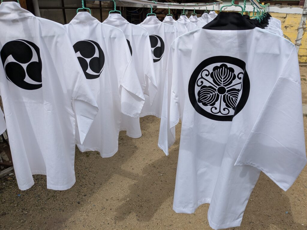 淡路 はんてんのご依頼いただきました。 未分類 2025.06.20 南あわじ市福永の若宮神社様の法被作成しました。 はっぴの衿は黒で。 ハッピの衿文字は白で。 はんてんの衿は若宮神社です。 袢天の背中は神社紋です。 伴天の背紋は丸に蔓三つ柏です。 半纏の作業です。 大変、喜んで頂きました。 毎度有難うございます。