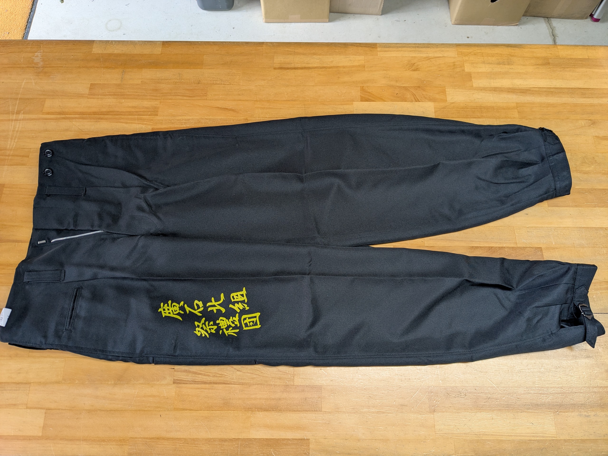 ズボンのプリントのご依頼いただきました 未分類 2025.11.17 洲本市五色町の廣石北組祭禮団様のニッカポッカに金色でプリントしました。 はっぴの中に着るドライTシャツも色を揃えてプリントしました。 ドライTシャツは弊店でTシャツをご用意し(メーカ定価の40%引き) ニッカポッカはお客様の持ち込みです。 大変喜んで頂きました。 毎度有難うございます。