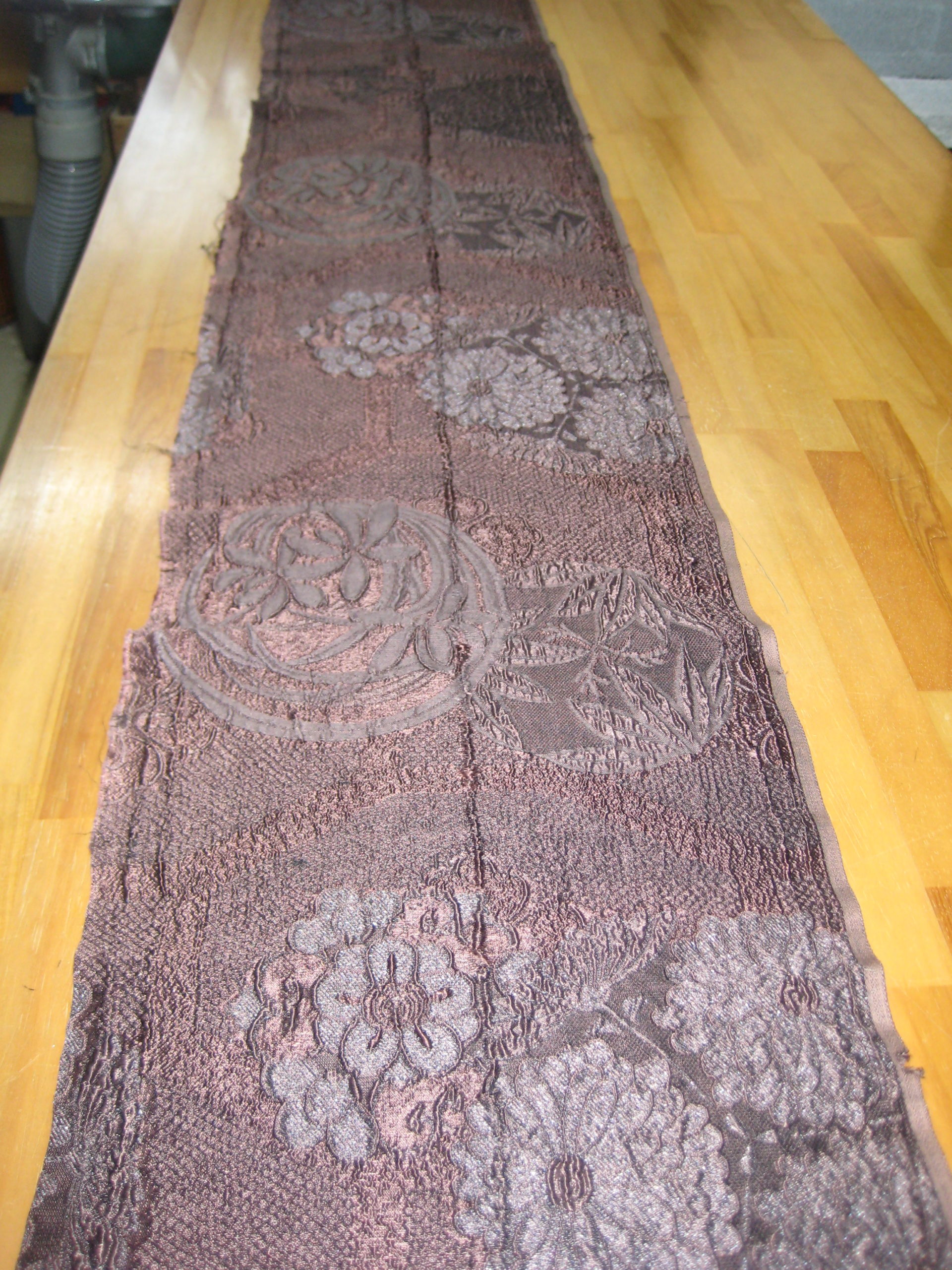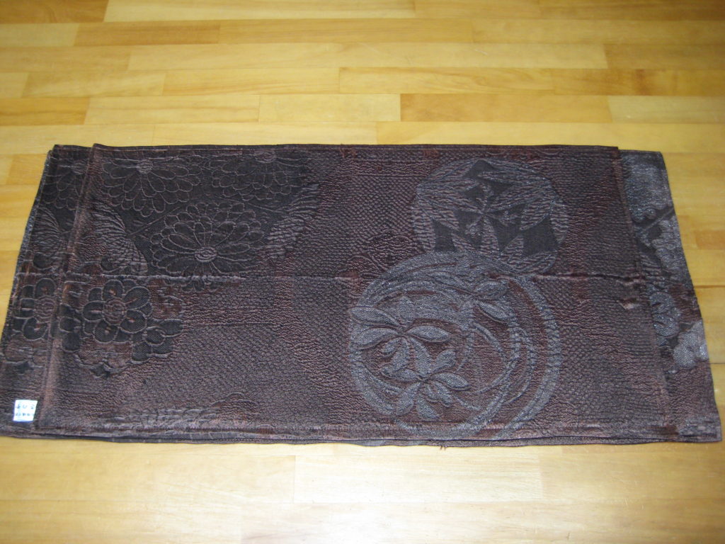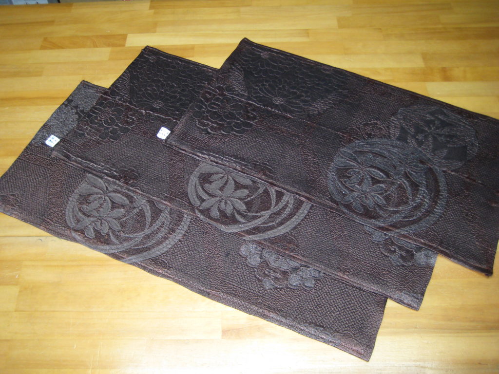 淡路島 着物クリーニングのご依頼いただきました。 未分類 2022.01.10 洲本市の常連様から古い帯を黒染めしてテーブルセンターを作成しました。 100年前位のお母様の帯だそうです。白地に朱赤で金糸と部分絞りしていました。 まず、黒染めして縮んだ分をゆのしで直して、ええとこどりして3枚にしました。 古いので裏を茶色のオックス(木綿)の裏生地を当てて仕立てました。 大変喜んで頂きました。2人のお嬢さんと本人さんの合計3枚分。有難うございました。