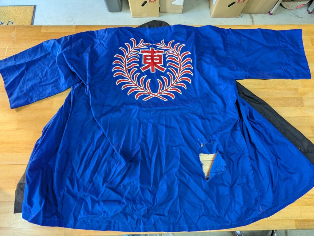 淡路 はっぴの修理のご依頼いただきました。 未分類 2026.02.03 淡路市柳沢東祭礼団様の法被の修理とクリーニングしました。 以前、弊店で作った袢纏です。 引っ掛けてかなり転んで背中が裂けて破れてしまっていました。 写真のように、かなり酷い状態でした。 修理不可でお客様は新調をしようか迷われていましたが、作ってまだ新しかったので修理しました。 袢天の生地自体が破れて裂けているため、普通に閉じても生地が吊るので見た目が悪くなるので 同色の生地を染めて裏から当てて直しました。 大変、喜んで頂きました。 毎度有難うございます。