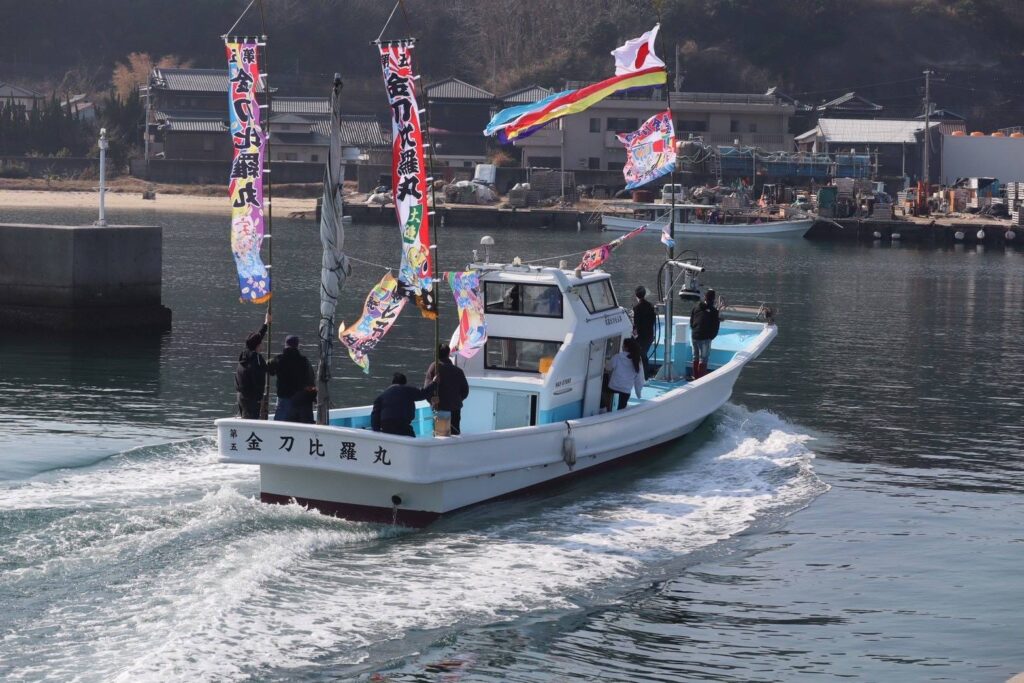 あわじ 旗のご依頼いただきました。 未分類 2026.03.10 淡路市のお客様の大漁旗作成しました。 先日からブログにあげていました、船主様から進水式の写真提供頂けました。 日の丸と吹き流しもご用意させて頂きました。 今回は納期が大変、短かったですが、全て間に合いました。 大変、天気が良かったとの事でした。 明日は、船尾に飾っている、大漁旗幟をあげさせて頂きます。 毎度有難うございます。