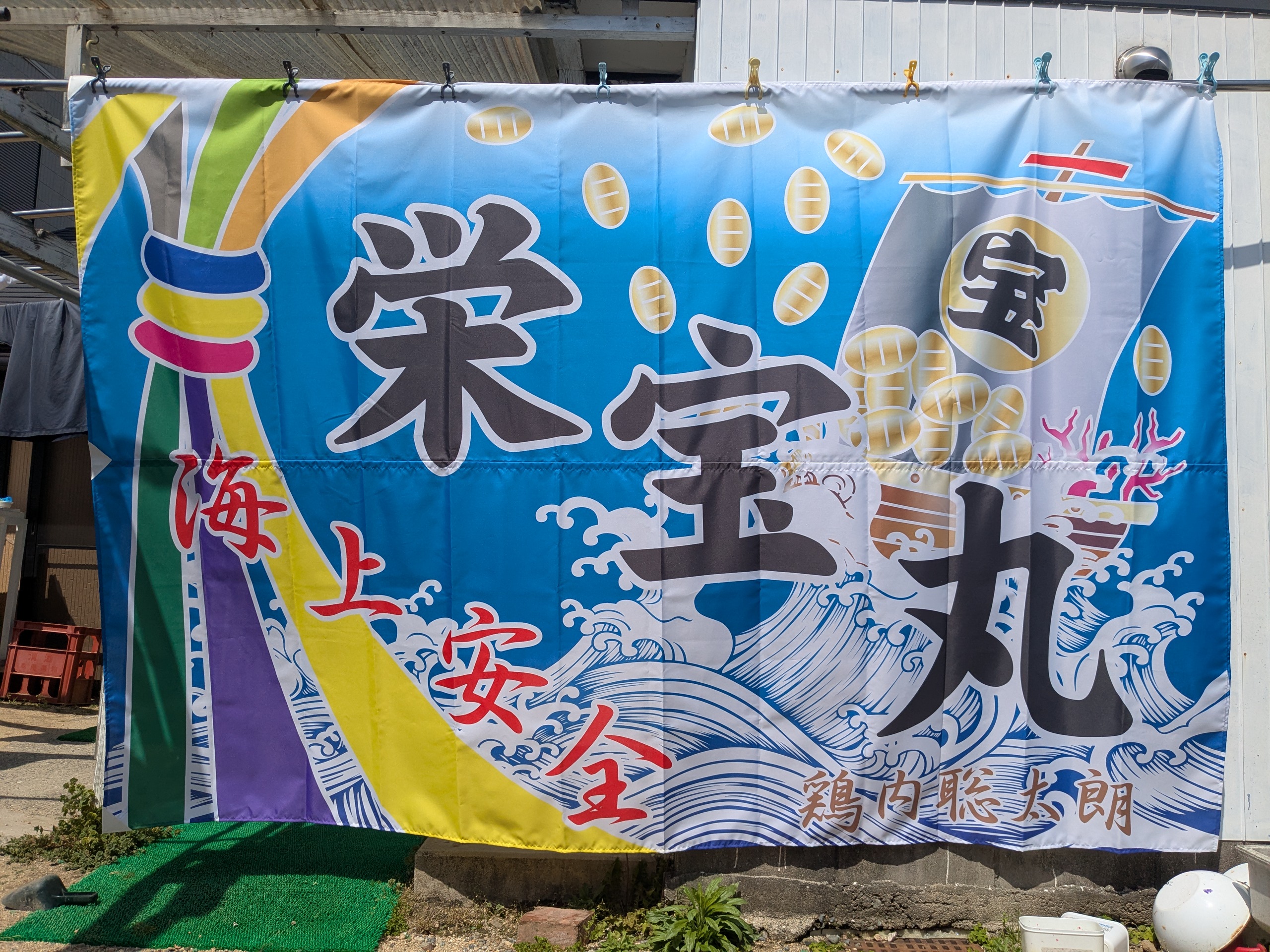 あわじしま 旗のご依頼いただきました。 未分類 2026.04.03 南あわじ市の大宝海運様の大漁旗作成させて頂きました。 束ね熨斗に白波に小判散らし宝船に「海上安全」です。 納期が大変、短かったので、厚手のポリエステル生地で作成しました。 大きいので真ん中で二枚につないでおります。 風に強い四方三巻補強仕立てです。 大変、喜んで頂きました。 毎度有難うございます。