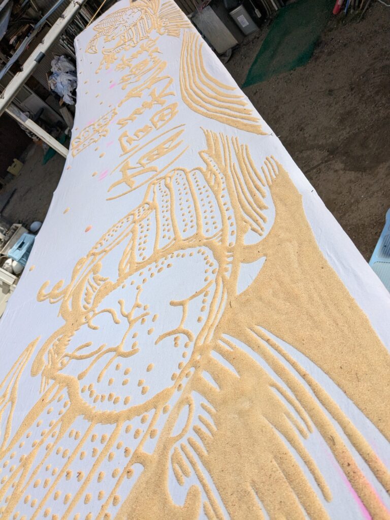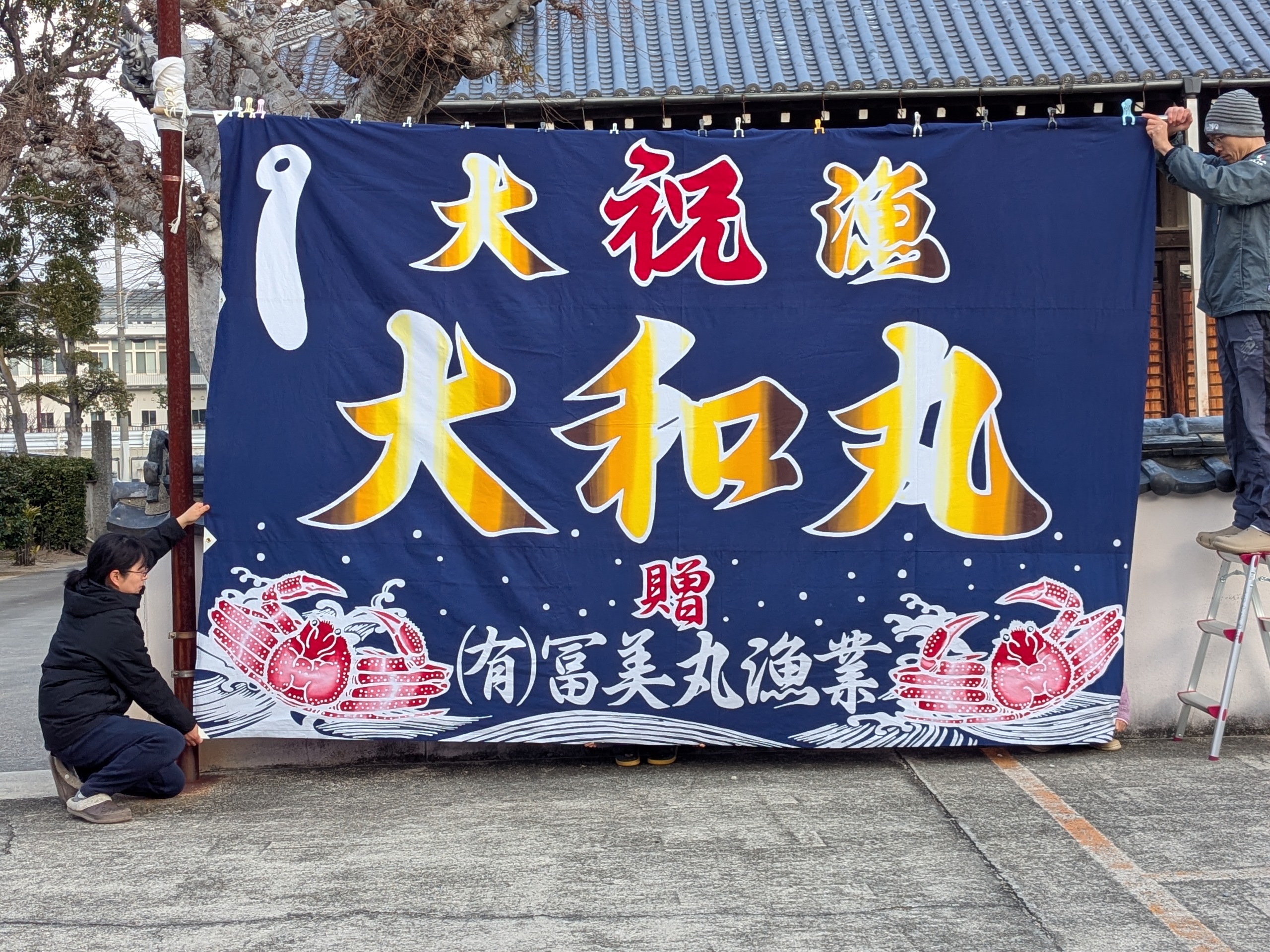 旗のご依頼いただきました。 未分類 2026.04.09 兵庫県新温泉町の冨美丸漁業様からのご依頼の大和丸大漁旗作成しました。 丸熨斗、祝大漁、向かい松葉ガニの一対に白波です。 三枚つなぎの大変、大きい旗です。 作成風景です。 大変、喜んで頂きました。 大さん、毎度有難うございます。