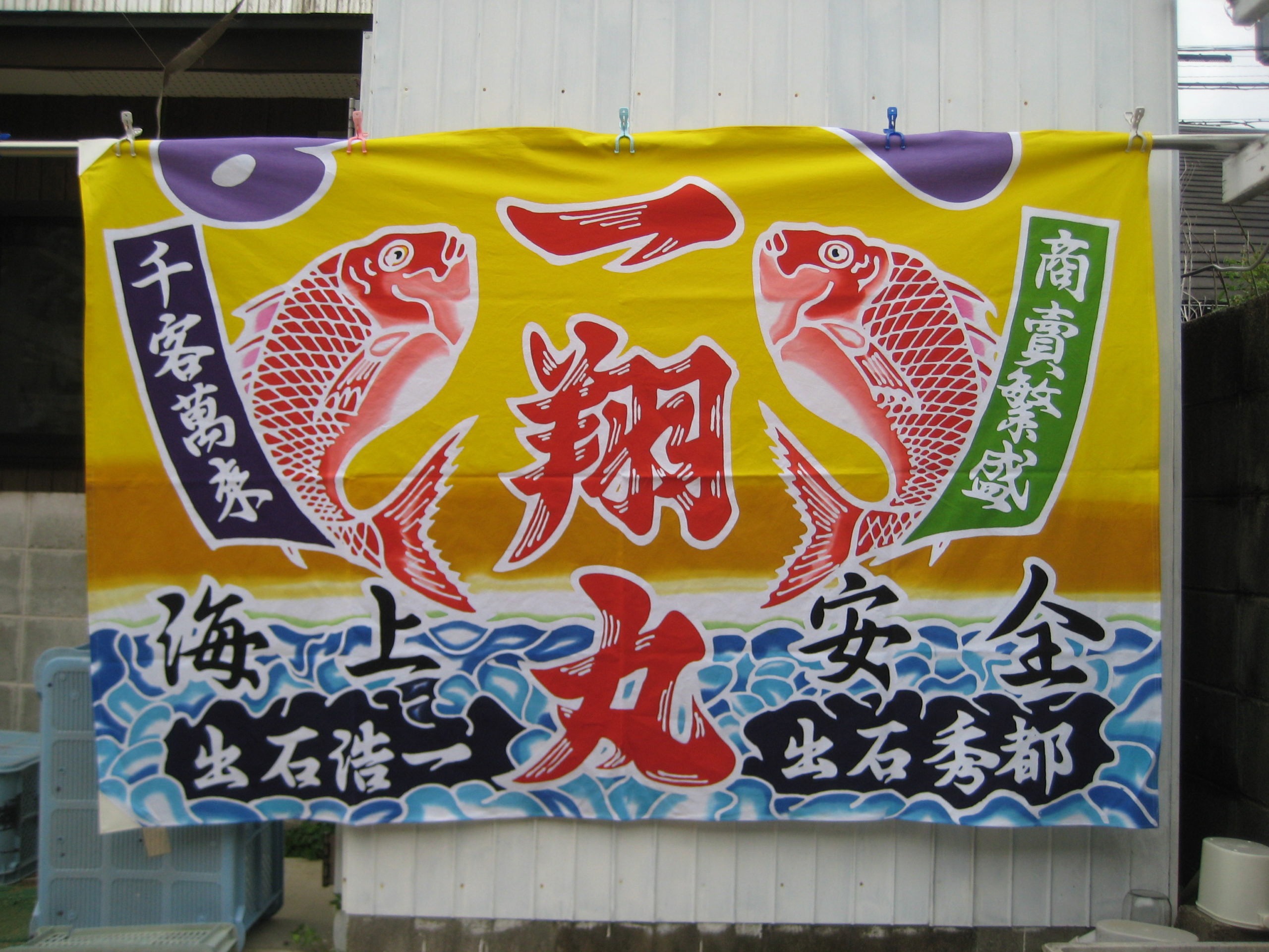 淡路島 大漁旗のご依頼いただきました。 未分類 2022.05.12 洲本市由良の釣船一翔丸様の大漁旗作成しました。 丸熨斗に海に「向かい二枚鯛に千客万来、商売繁盛、海上安全」弊店のオリジナルのデザインですので同業者様はパクらないように宜しくお願い致します。 出石様、毎度、有難うございます。