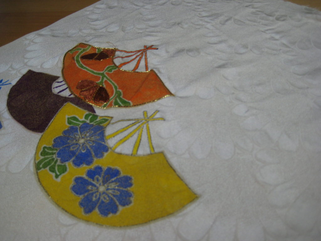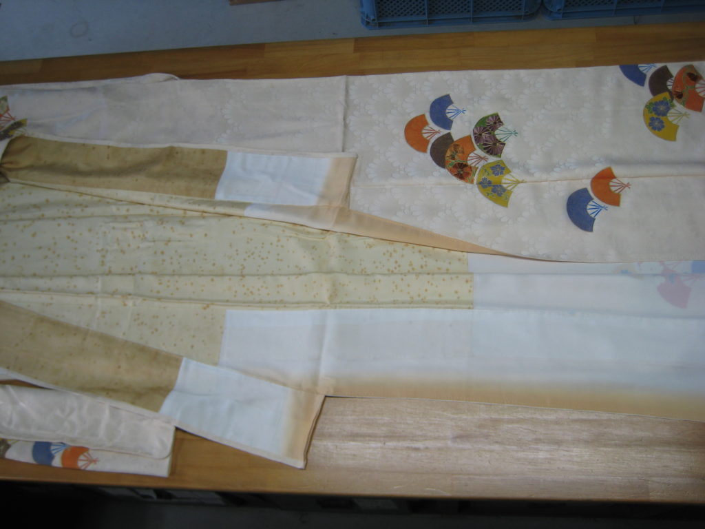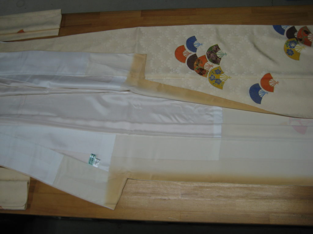 八掛はそのまま使いました。反物の状態でガード加工し(なぜなら、反物の状態でガード加工する方が安いので@8000です。)加工済み証明のタグ付き