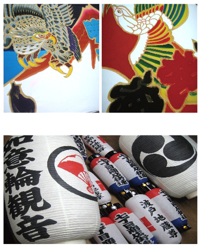 当店は85余年、洲本の栄町で営業させていただいております。少なくなりましたが、染物は一枚ずつ刷毛で染め、ちょうちんは一張ずつ手書きしております。淡路島にも旗、幕、のぼり、はんてん、ちょうちんなど手掛ける職人がいる事を皆さまに知っていただけるだけで幸せでございます。
